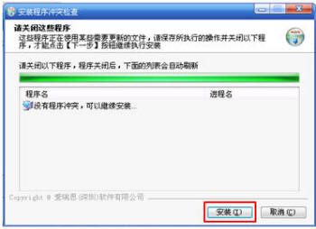 (6) 正在进行安装程序冲突检查,如有检测到程序冲突请根据提示关闭有关程序然后继续安装进程,若无程序冲突请点击 【安装】按钮继续安装。