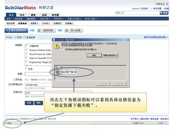 4. 检索成果时,为何系统出现浏览器脚本错误,提示“指定资源下载失败”?