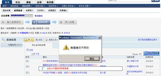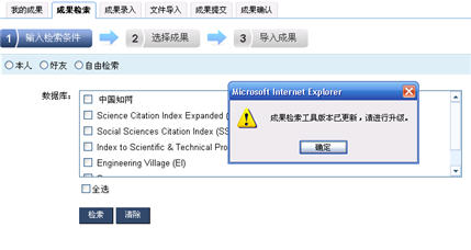 (3) 所选数据库正在维护中,请稍候再试。 如果你检索结果出现以上提示,代表你当前所在IP网段没有对应文献库的使用权限。 目前科研之友系统提供检索的英文文献库,如:SCI,SSCI,ISTP,EI,都需要购买使用权限方能检索到结果,请确认贵校当前是否有购买。 如贵校有购买,则可能是以上列出提示的后两种,建议你在贵校图书馆登录成果在线进行检索;如贵校没有购买,建议在 购买了使用权限的单位进行检索或邀请好友帮你检索成果并推荐给你; 如果无法通过系统检索,你也可以通过手工录入的方式录入至系统中(我的成果——录入成果或文件导入)。