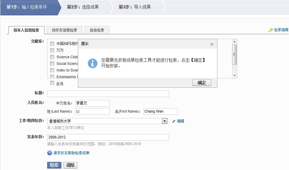 (1) 进入检索页面后,系统会主动提示用户安装跨文献库检索工具,请点击 【确定】按钮开始安装跨文献库检索工具。