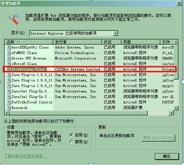 (1) IE禁用了安装的插件。请在 “工具->管理加载项->启用或禁用加载项”查看IrisOctopus Class的加载项是否被禁用。如果是, 请启用,然后关闭IE重新打开。